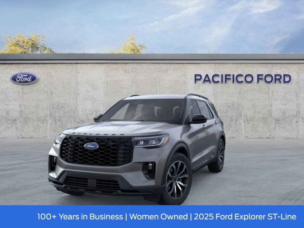 Pacifico Ford is proud to present you with another great new Ford. This 2025 Ford Explorer ST-Line is loaded with the following Factory Options:Equipment Group 300A Standard Package, 4WD, 10 Speakers, 2nd Row Captain's Chairs w/E-Z Entry & Armrest, 3.58 Non-Limited Slip Rear Axle, 3rd row seats: bench, 4-Wheel Disc Brakes, ABS brakes, Air Conditioning, Alloy wheels, AM/FM radio: SiriusXM with 360L, Apple CarPlay/Android Auto, Auto High-beam Headlights, Automatic temperature control, Brake assist, Bumpers: body-color, Compass, Delay-off headlights, Driver door bin, Driver vanity mirror, Dual front impact airbags, Dual front side impact airbags, Electronic Stability Control, Emergency communication system: 911 Assist, Exterior Parking Camera Rear, Four wheel independent suspension, Front anti-roll bar, Front Bucket Seats, Front Center Armrest, Front dual zone A/C, Front fog lights, Front reading lights, Fully automatic headlights, Garage door transmitter, Heated door mirrors, Heated front seats, Heated steering wheel, Heated Unique Cloth Captain's Chairs, Illuminated entry, Knee airbag, Leather steering wheel, Low tire pressure warning, Navigation System, Occupant sensing airbag, Outside temperature display, Overhead airbag, Overhead console, Panic alarm, Passenger door bin, Passenger vanity mirror, Power door mirrors, Power driver seat, Power Liftgate, Power passenger seat, Power steering, Power windows, Radio: B&O Sound System by Bang & Olufsen, Rear air conditioning, Rear anti-roll bar, Rear reading lights, Rear window defroster, Rear window wiper, Remote keyless entry, Security system, Speed control, Speed-sensing steering, Speed-Sensitive Wipers, Split folding rear seat, Spoiler, Steering wheel mounted audio controls, Tachometer, Telescoping steering wheel, Tilt steering wheel, Traction control, Trip computer, Variably intermittent wipers, and Wheels: 20" Ebony-Painted Machined Aluminum.