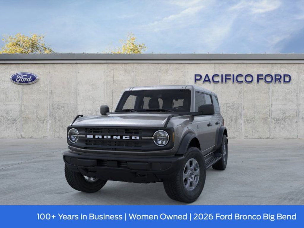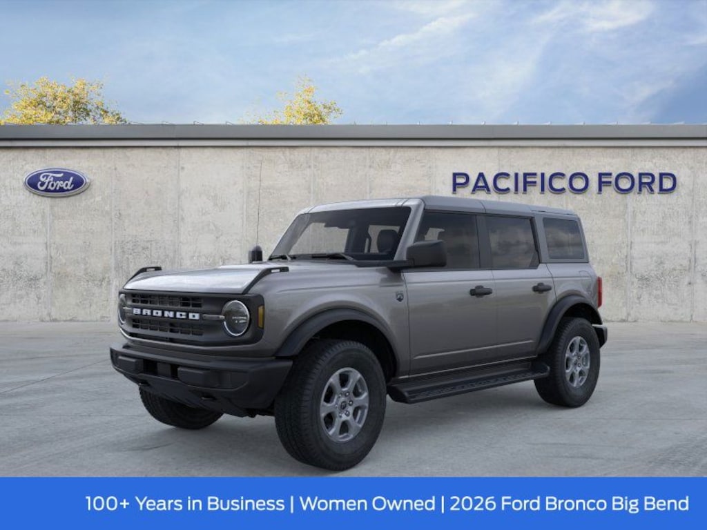 Pacifico Ford is proud to present you with another great new Ford. This 2026 Ford Bronco Big Bend is loaded with the following Factory Options:Equipment Group 222A Mid Package (2-Door Intelligent Access with Lock/Unlock, AM/FM Stereo, Ambient Footwell Lighting, Cloth Bucket Seats, Connected Navigation, Driver and Front Passenger Illuminated Sliding Visor Vanity Mirrors, Dual Smart Charging USB Ports, Dual-Zone Electronic Automatic Temperature Control, Front Row Heated Seats, Pro Power Onboard - 400W, Rear Parking Sensors, SiriusXM with 360L, SYNC 4, and Wheels: 17" Carbonized Gray-Painted Aluminum), Ford Connectivity Package (1-Year Included), 4-Wheel Disc Brakes, 4.46 Axle Ratio, 7 Speakers, ABS brakes, Air Conditioning, Alloy wheels, AM/FM radio: SiriusXM with 360L, Auto High-Beam Headlamps, Auto High-beam Headlights, BLIS Blind Spot Information System, Brake assist, Carbonized Gray Molded-in-Color Hard Top, Compass, Delay-off headlights, Driver door bin, Driver vanity mirror, Dual front impact airbags, Dual front side impact airbags, Electronic Stability Control, Emergency communication system: 911 Assist, Exterior Parking Camera Rear, Front and Rear Floor Liners Without Carpet Floor Mats, Front anti-roll bar, Front Bucket Seats, Front Center Armrest, Front reading lights, Front wheel independent suspension, Fully automatic headlights, Heated door mirrors, Illuminated entry, Integrated roll-over protection, Lane-Keeping System, Low tire pressure warning, Occupant sensing airbag, Outside temperature display, Overhead airbag, Overhead console, Panic alarm, Passenger door bin, Passenger vanity mirror, Power door mirrors, Power steering, Power windows, Pre-Collision Assist with Automatic Emergency Braking, Radio data system, Rear-View Camera, Rear-Window Defroster and Washer, Remote keyless entry, Security system, Side Step, Speed control, Split folding rear seat, Steering wheel mounted audio controls, Tachometer, Telescoping steering wheel, Tilt steering wheel, Traction control, Trip computer, and Variably intermittent wipers. Recent Arrival!