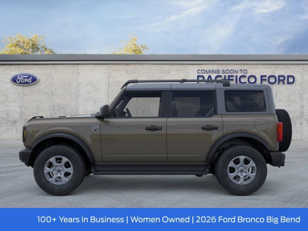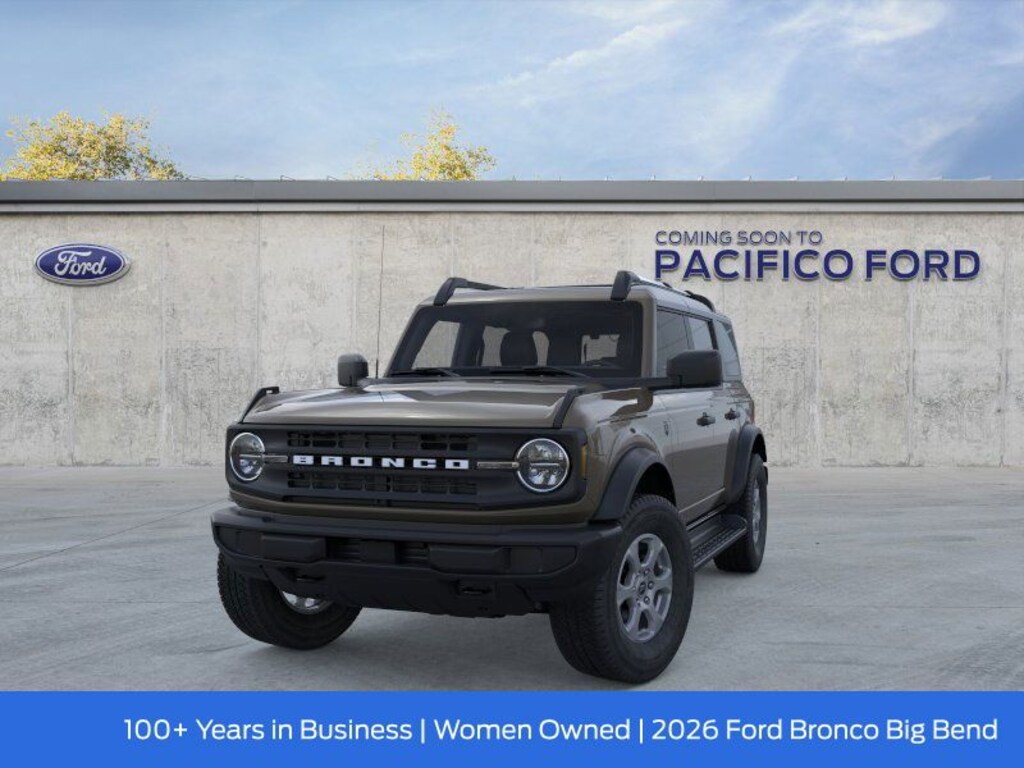 Pacifico Ford is proud to present you with another great new Ford. This 2026 Ford Bronco Big Bend is loaded with the following Factory Options:Equipment Group 222A Mid Package (2-Door Intelligent Access with Lock/Unlock, AM/FM Stereo, Ambient Footwell Lighting, Cloth Bucket Seats, Connected Navigation, Driver and Front Passenger Illuminated Sliding Visor Vanity Mirrors, Dual Smart Charging USB Ports, Dual-Zone Electronic Automatic Temperature Control, Front Row Heated Seats, Pro Power Onboard - 400W, Rear Parking Sensors, SiriusXM with 360L, SYNC 4, and Wheels: 17" Carbonized Gray-Painted Aluminum), Ford Connectivity Package (1-Year Included), 4-Wheel Disc Brakes, 4.46 Axle Ratio, 7 Speakers, ABS brakes, Air Conditioning, Alloy wheels, AM/FM radio: SiriusXM with 360L, Auto High-Beam Headlamps, Auto High-beam Headlights, Black Roof Rails with Crossbars, BLIS Blind Spot Information System, Brake assist, Carbonized Gray Molded-in-Color Hard Top, Compass, Delay-off headlights, Driver door bin, Driver vanity mirror, Dual front impact airbags, Dual front side impact airbags, Electronic Stability Control, Emergency communication system: 911 Assist, Exterior Parking Camera Rear, Front and Rear Floor Liners Without Carpet Floor Mats, Front anti-roll bar, Front Bucket Seats, Front Center Armrest, Front reading lights, Front wheel independent suspension, Fully automatic headlights, Heated door mirrors, Illuminated entry, Integrated roll-over protection, Lane-Keeping System, Low tire pressure warning, Occupant sensing airbag, Outside temperature display, Overhead airbag, Overhead console, Panic alarm, Passenger door bin, Passenger vanity mirror, Power door mirrors, Power steering, Power windows, Pre-Collision Assist with Automatic Emergency Braking, Radio data system, Rear-View Camera, Rear-Window Defroster and Washer, Remote keyless entry, Security system, Side Step, Speed control, Split folding rear seat, Steering wheel mounted audio controls, Tachometer, Telescoping steering wheel, Tilt steering wheel, Traction control, Trip computer, and Variably intermittent wipers. Recent Arrival!
