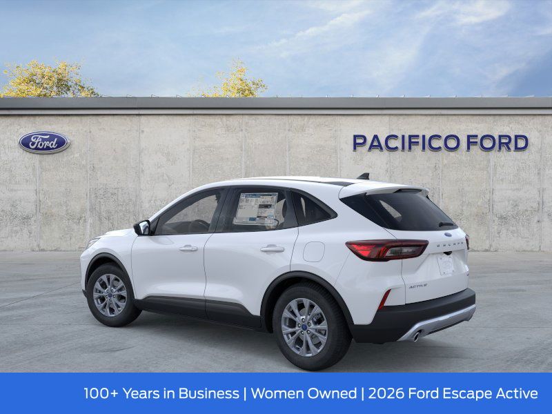 Pacifico Ford is proud to present you with another great new Ford. This 2026 Ford Escape Active is loaded with the following Factory Options:Equipment Group 200A (3.81 Axle Ratio, 6-Way Manual Driver Seat, Radio: AM/FM Stereo with SiriusXM 360L, Unique Cloth Front Bucket Seats, and Wheels: 17" Shadow Silver-Painted Aluminum), AWD, 4-Wheel Disc Brakes, 6 Speakers, ABS brakes, Air Conditioning, Alloy wheels, AM/FM radio: SiriusXM 360L, Auto High-beam Headlights, Automatic temperature control, Brake assist, Compass, Delay-off headlights, Driver door bin, Driver vanity mirror, Dual front impact airbags, Dual front side impact airbags, Electronic Stability Control, Emergency communication system: SYNC 4 911 Assist, Four wheel independent suspension, Front and Rear Floor Liners with Carpet Mats, Front anti-roll bar, Front Bucket Seats, Front dual zone A/C, Front License Plate Bracket, Front reading lights, Fully automatic headlights, Illuminated entry, Knee airbag, Low tire pressure warning, Occupant sensing airbag, Outside temperature display, Overhead airbag, Overhead console, Panic alarm, Passenger door bin, Passenger vanity mirror, Power door mirrors, Power Liftgate, Power steering, Power windows, Radio data system, Rear anti-roll bar, Rear reading lights, Rear window defroster, Rear window wiper, Remote keyless entry, Speed control, Speed-sensing steering, Speed-Sensitive Wipers, Split folding rear seat, Spoiler, Steering wheel mounted audio controls, Tachometer, Telescoping steering wheel, Tilt steering wheel, Traction control, Trip computer, and Variably intermittent wipers.
