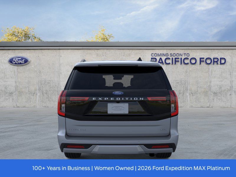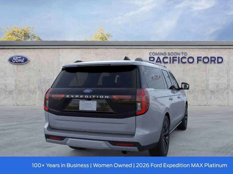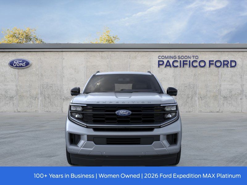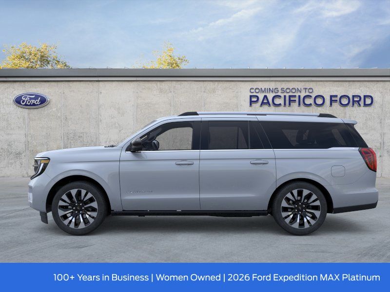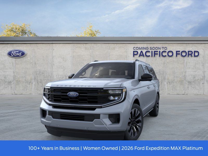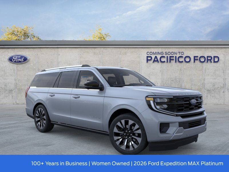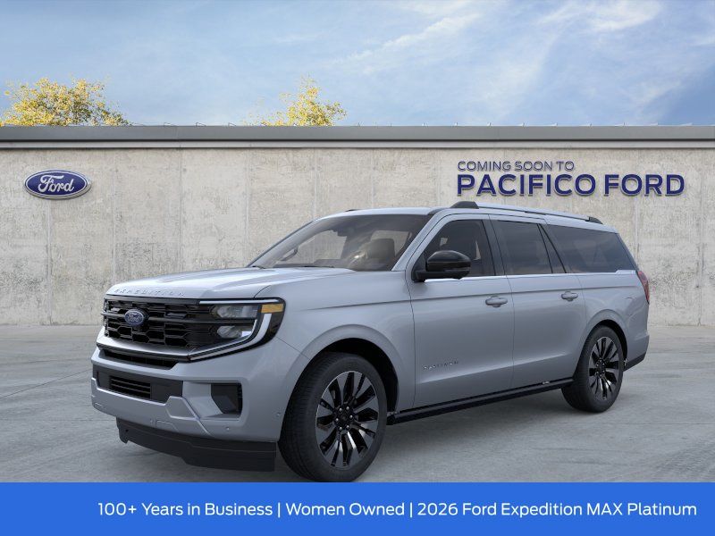 Pacifico Ford is proud to present you with another great new Ford. This 2026 Ford Expedition Max Platinum is loaded with the following Factory Options:Driver's Package (Radio: B&O Play Unleashed and SiriusXM with 360L), Equipment Group 600A Standard Package (2nd Row Power-Folding Captain's Chairs, 3.73 Axle Ratio, BlueCruise Equipped (90-Day Trial), Ford Digital Experience, Heated and Ventilated Leather Front Captain's Chairs, Power Tilt/Telescopic Steering Wheel with Memory, Radio: B&O Sound System by Bang and Olufsen, and Wheels: 20" x 8.5" Ebony Bright Machined Aluminum), Ford Connectivity Package (1-Year Included), 10 Speakers, 3rd row seats: split-bench, 4-Wheel Disc Brakes, ABS brakes, Air Conditioning, Alloy wheels, AM/FM radio: SiriusXM with 360L, Apple CarPlay/Android Auto, Auto High-beam Headlights, Auto-dimming door mirrors, Auto-dimming Rear-View mirror, Automatic temperature control, Black Onyx Painted Power Deployable Running Boards, Brake assist, Bumpers: body-color, Compass, Delay-off headlights, Driver door bin, Driver vanity mirror, Dual front impact airbags, Dual front side impact airbags, Electronic Stability Control, Emergency communication system: 911 Assist, Exterior Parking Camera Rear, Four wheel independent suspension, Front and 2nd Rows Floor Liners (tray Style), Front anti-roll bar, Front Bucket Seats, Front Center Armrest, Front dual zone A/C, Front reading lights, Fully automatic headlights, Garage door transmitter, Genuine wood dashboard insert, Genuine wood door panel insert, Heated door mirrors, Heated front seats, Heated rear seats, Heated steering wheel, Illuminated entry, Intersection Assist, Leather steering wheel, Low tire pressure warning, Memory seat, Navigation System, Occupant sensing airbag, Outside temperature display, Overhead airbag, Overhead console, Panic alarm, Passenger door bin, Passenger vanity mirror, Power door mirrors, Power driver seat, Power moonroof: Vista Roof, Power passenger seat, Power steering, Power windows, Radio data system, Rain sensing wipers, Rear air conditioning, Rear anti-roll bar, Rear reading lights, Rear window defroster, Rear window wiper, Reclining 3rd row seat, Remote keyless entry, Security system, Speed control, Speed-sensing steering, Speed-Sensitive Wipers, Split folding rear seat, Spoiler, Steering wheel memory, Steering wheel mounted audio controls, Tachometer, Telescoping steering wheel, Tilt steering wheel, Traction control, Trip computer, Turn signal indicator mirrors, Variably intermittent wipers, Ventilated front seats, Voltmeter, and Wheels: 22" x 9.0" Ebony Bright Machined Face Aluminum. Recent Arrival!