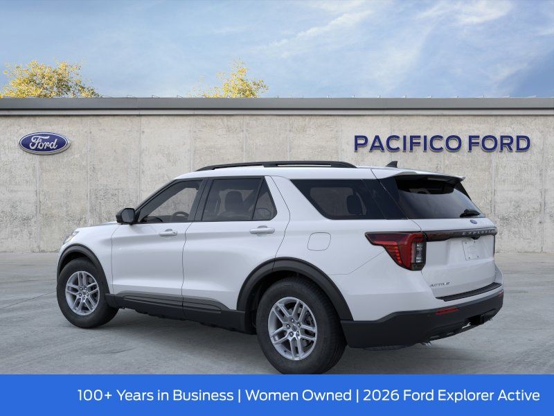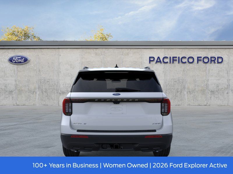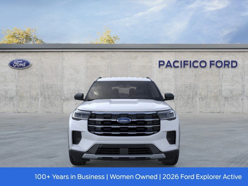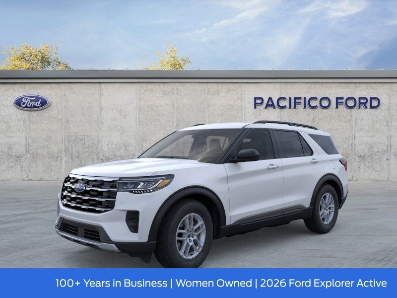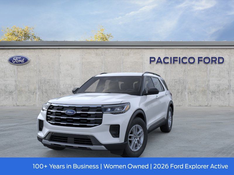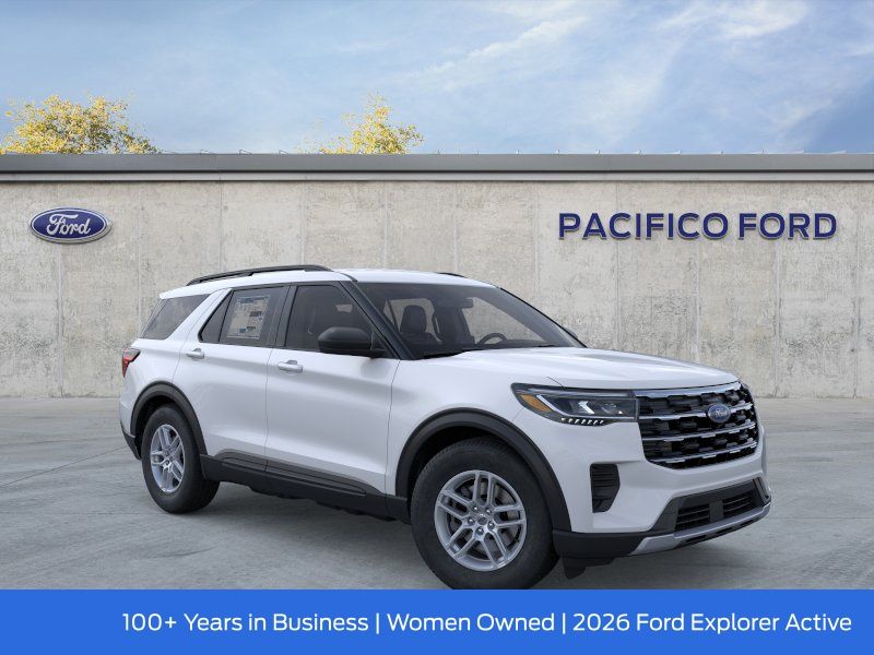 Pacifico Ford is proud to present you with another great new Ford. This 2026 Ford Explorer Active is loaded with the following Factory Options:4WD, 2nd Row 35/30/35 Bench with E-Z Entry and Armrest, 3rd row seats: bench, 4-Wheel Disc Brakes, 6 Speakers, ABS brakes, Air Conditioning, Alloy wheels, AM/FM radio: SiriusXM with 360L, AM/FM Stereo, Apple CarPlay/Android Auto, Auto High-beam Headlights, Automatic temperature control, Brake assist, Bumpers: body-color, Compass, Delay-off headlights, Driver door bin, Driver vanity mirror, Dual front impact airbags, Dual front side impact airbags, Electronic Stability Control, Emergency communication system: 911 Assist, Exterior Parking Camera Rear, Four wheel independent suspension, Front anti-roll bar, Front Bucket Seats, Front Center Armrest, Front dual zone A/C, Front reading lights, Fully automatic headlights, Heated door mirrors, Illuminated entry, Knee airbag, Low tire pressure warning, Navigation System, Occupant sensing airbag, Outside temperature display, Overhead airbag, Overhead console, Panic alarm, Passenger door bin, Passenger vanity mirror, Power door mirrors, Power driver seat, Power steering, Power windows, Rear air conditioning, Rear anti-roll bar, Rear reading lights, Rear window defroster, Rear window wiper, Remote keyless entry, Security system, Speed control, Speed-sensing steering, Speed-Sensitive Wipers, Split folding rear seat, Spoiler, Steering wheel mounted audio controls, Tachometer, Telescoping steering wheel, Tilt steering wheel, Traction control, Trip computer, Variably intermittent wipers, and Wheels: 18" Sparkle Silver-Painted Aluminum.