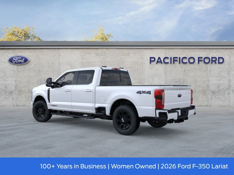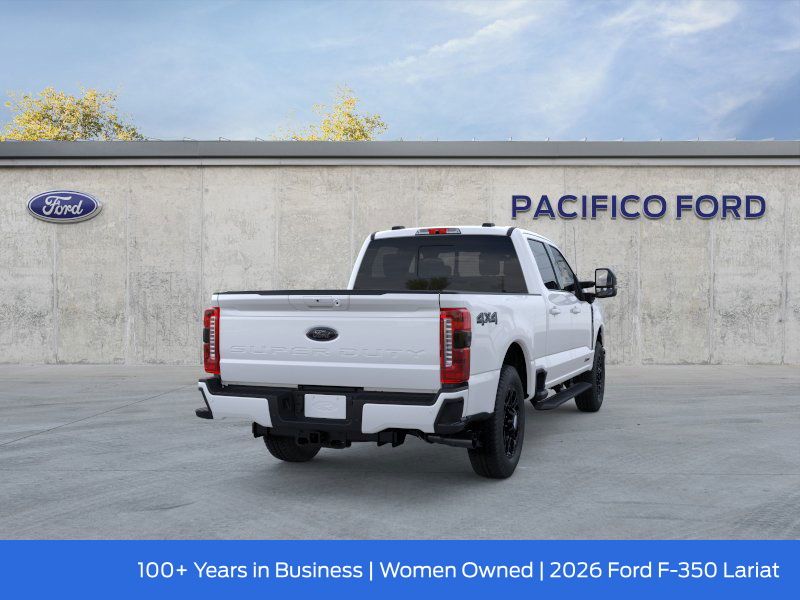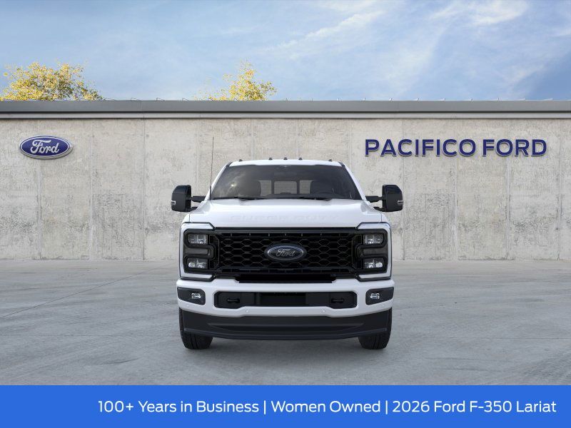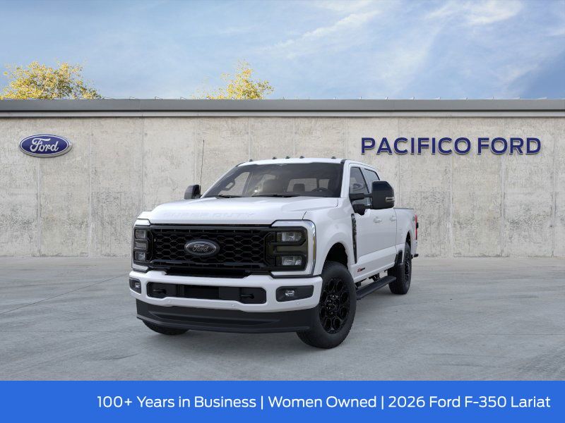Pacifico Ford is proud to present you with another great new Ford. This 2026 Ford F-350SD Lariat is loaded with the following Factory Options:Black Appearance Package (6" Ebony Black Angular Running Boards, Black Painted Front Grille Surround, Body Color Front and Rear Bumpers, and Ebony Black Painted Mirror Caps), Ford Connectivity Package (1-Year Included), Internet access capable: 5G Modem - Ford Connectivity Package, Lariat Premium Package (Power-Sliding Rear-Window with Defrost, Privacy Glass, Pro Trailer Backup Assist, and Pro Trailer Hitch Assist), Lariat Ultimate Package (4-Way Adjustable Headrests, Head-Up Display, Power-Deployable Running Boards, Radio: B&O Unleashed Sound System by Bang & Olufsen, SiriusXM with 360L, SYNC 4 with Enhanced Voice Recognition, and Tailgate Step and Handle), Order Code 618A (Flow-Through Console, Front ActiveX Trimmed 40/Console/40 Seats, Radio: B&O Sound System by Bang and Olufsen, and Wheels: 18" Bright Machined and Carbonized Gray Aluminum), Snow Plow Prep Package, 4WD, 190 Amp Alternator, 4-Wheel Disc Brakes, 8 Speakers, ABS brakes, Adaptive Cruise Control with Stop-and-Go, Adjustable pedals, Air Conditioning, All-Weather Floor Mats, Alloy wheels, AM/FM radio: SiriusXM with 360L, Auto High-beam Headlights, Auto-dimming Rear-View mirror, Automatic High Beam, Automatic temperature control, BLIS with Cross-Traffic Alert, Brake assist, Bumpers: chrome, Compass, Delay-off headlights, Driver door bin, Driver vanity mirror, Dual AGM 68 AH Battery, Dual front impact airbags, Dual front side impact airbags, Electronic Stability Control, Emergency communication system: SYNC 4 911 Assist, Engine Block Heater, Front and Rear Parking Sensors, Front anti-roll bar, Front Bucket Seats, Front Center Armrest, Front dual zone A/C, Front fog lights, Front reading lights, Fully automatic headlights, Garage door transmitter, Hard Folding Tonneau Pickup Box Cover, Heated door mirrors, Heated front seats, Heated rear seats, Heated steering wheel, Illuminated entry, Lane-Keeping System, LED Roof Clearance Lights, Low tire pressure warning, Max Recline Seats, Memory seat, Navigation system: Connected Navigation, Onboard Scales and Smart Hitch, Outside temperature display, Overhead airbag, Overhead console, Panic alarm, Passenger door bin, Passenger vanity mirror, Pedal memory, Post-Collision Braking, Power door mirrors, Power driver seat, Power passenger seat, Power steering, Power windows, Pre-Collision Assist, Pro Power Onboard - 2kW, Rain sensing wipers, Rear Parking Sensors, Rear reading lights, Rear seat center armrest, Rear step bumper, Rear window defroster, Remote keyless entry, SecuriCode Keyless Entry Keypad (driver's Side), Security system, Speed control, Split folding rear seat, Steering wheel mounted audio controls, Tachometer, Telescoping steering wheel, Tilt steering wheel, Traction control, Trip computer, Turn signal indicator mirrors, Twin Panel Power Moonroof, Upfitter Switches (6), Variably intermittent wipers, and Ventilated front seats.
