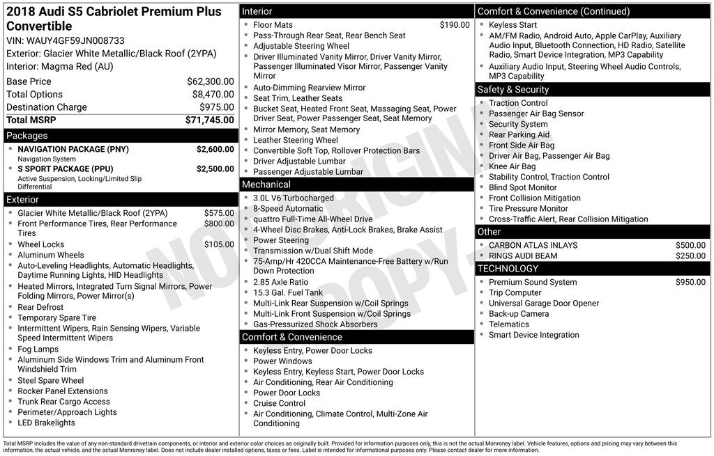Luxury, performance, and open-air driving come together in this 2018 Audi S5 Cabriolet Premium Plus, finished in elegant Glacier White Metallic with a striking Magma Red Fine Nappa leather interior. Powered by Audiâs legendary 3.0L TFSI turbocharged V6 producing 354 horsepower, this S5 delivers exhilarating performance with the confidence of quattro all-wheel drive.