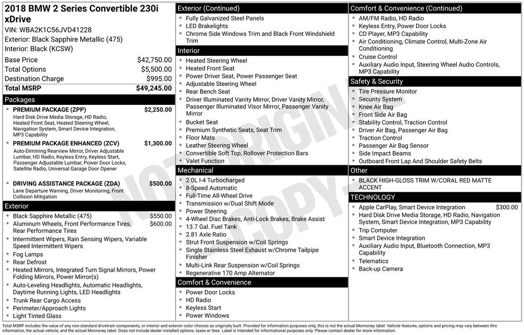 This 2018 BMW 230i xDrive Convertible delivers a perfect blend of open-air driving excitement, luxury craftsmanship, and all-wheel-drive confidence. When new, this BMW carried an original MSRP of $48,285, reflecting its premium build quality, performance engineering, and high-end features.