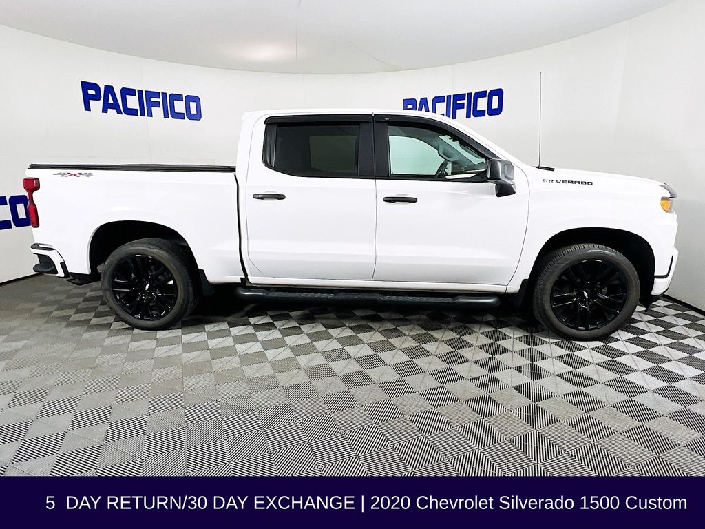 This pre-owned 2020 Silverado 1500 Custom 4WD Crew Cab delivers turbocharged performance, bold blacked-out styling, and serious towing capability in classic Summit White with Jet Black interior.