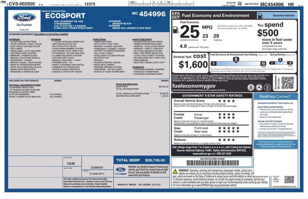 Boasting a 2.0L I4 Ti-VCT GDI engine and 4WD, this EcoSport SE delivers impressive performance and efficiency, with an EPA-estimated 23 MPG in the city and 29 MPG on the highway. The 6-speed automatic transmission provides smooth, responsive power delivery, making this vehicle a joy to drive in any condition.