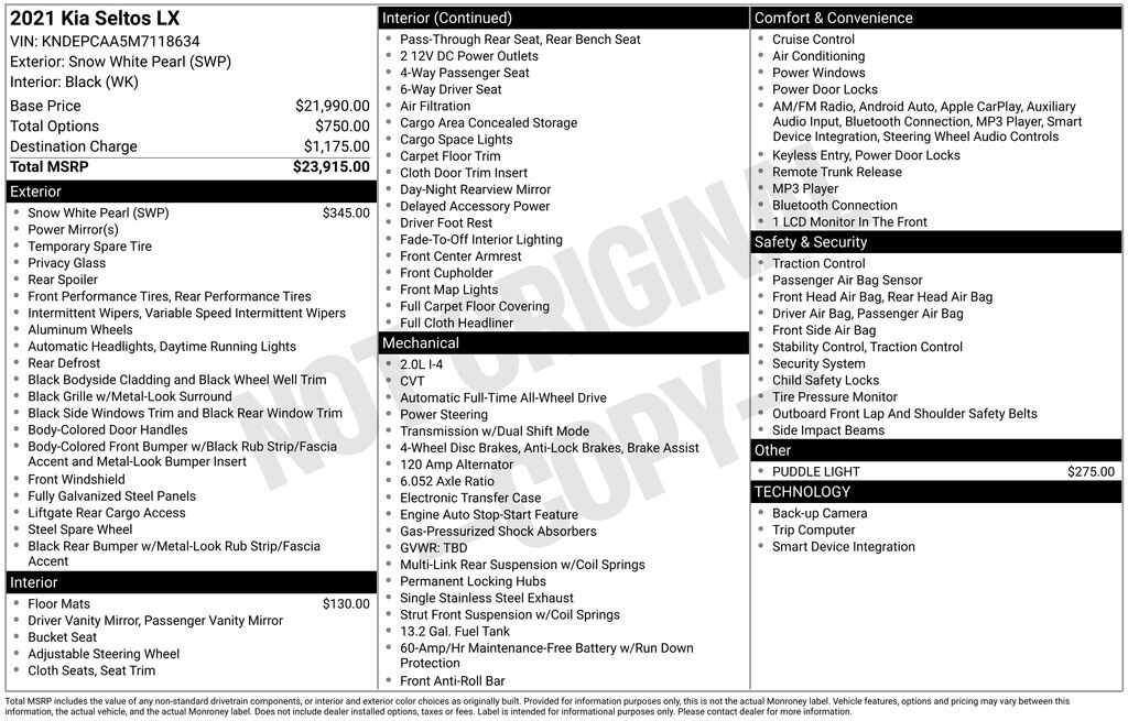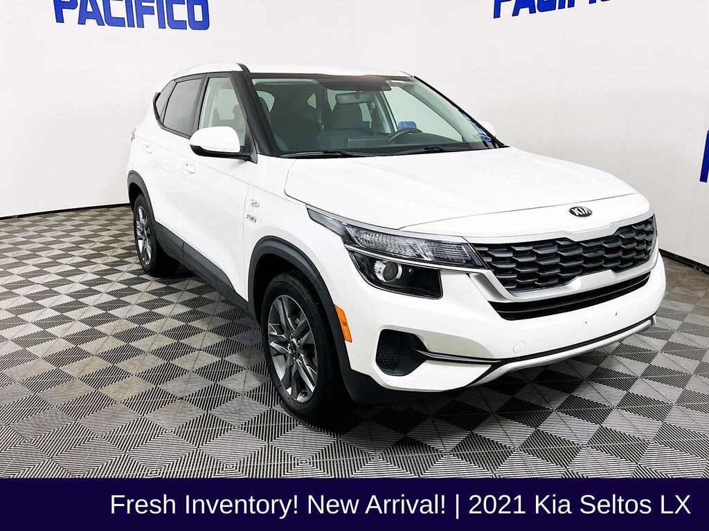 Clean CARFAX. Odometer is 28137 miles below market average! Snow White Pearl 2021 Kia Seltos LX 4D Sport Utility AWD CVT 2.0L I4 MPI