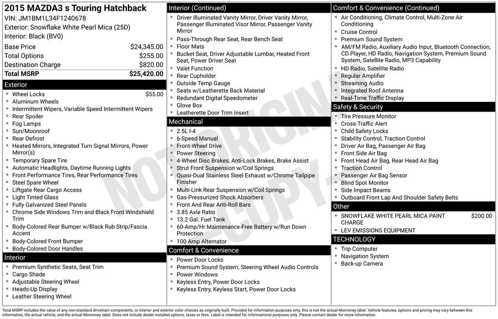Whether you're commuting to work or embarking on a weekend adventure, this 2015 Mazda Mazda3 s Touring is the perfect companion. Its dynamic performance, impressive fuel economy, and comprehensive suite of features make it a standout choice in the compact car segment.